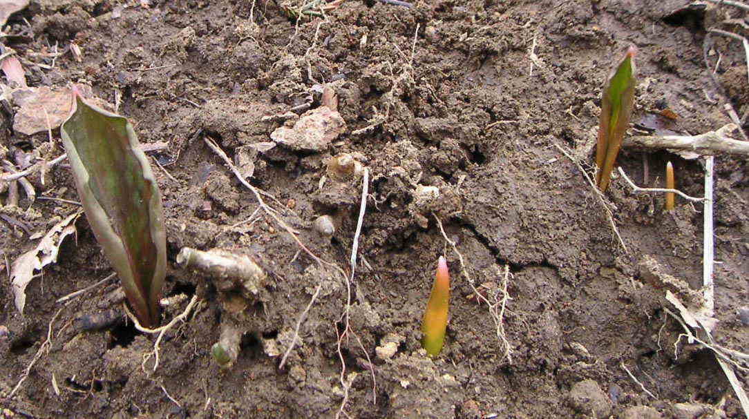 開花前のカタクリですみません。 角田登山コースは灯台コース桜尾根コース、宮前コースでは群生地があり開花時は登山客で混雑します。 又バスツアー等も企画されています。 |