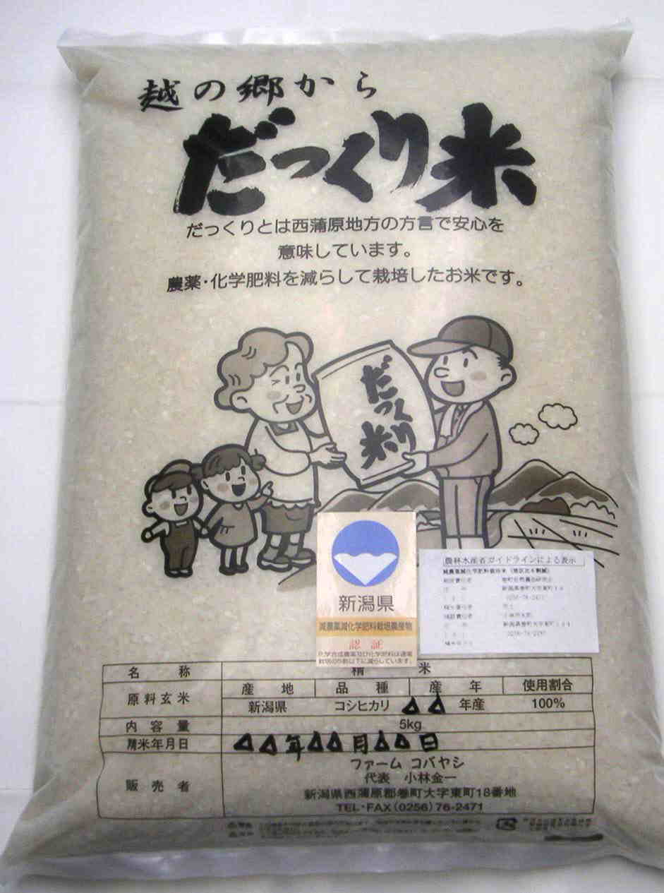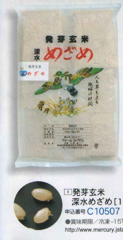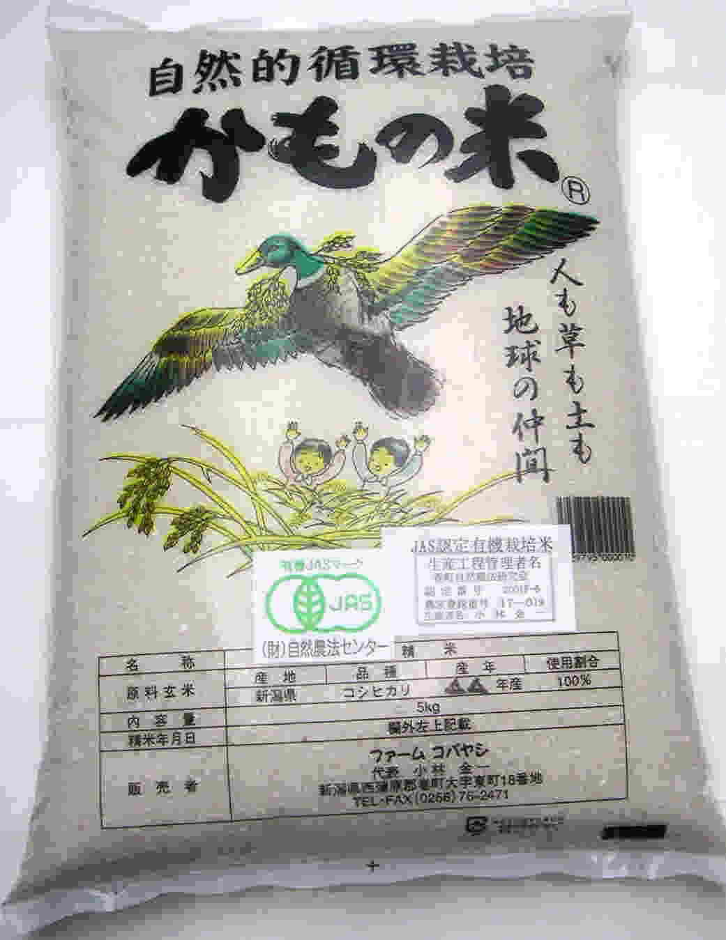 JAS認証有機栽培米(JAS有機米)、新潟県認証特別栽培米(減減米)、鴨の米加工「めざめ」発芽玄米。
