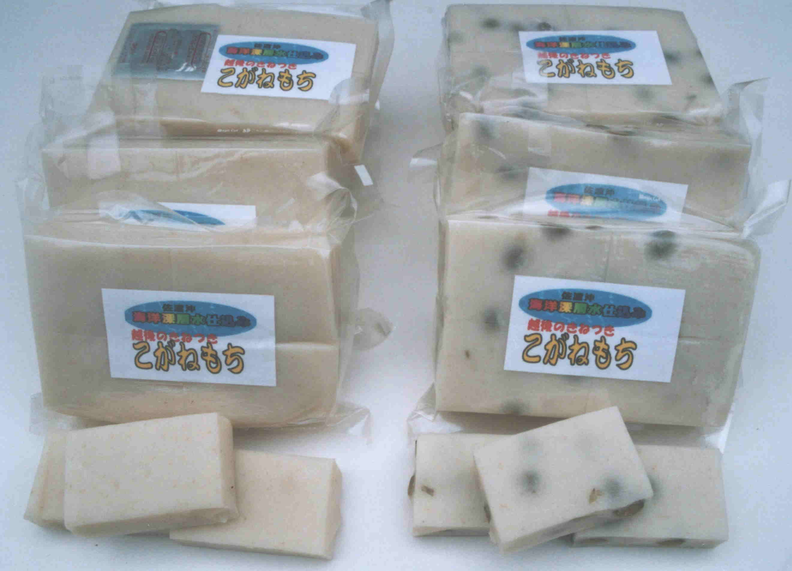 | こがねもち粉を原料に生地から手作り粘りが最高。消費税込み。 | コシヒカリ粉を原料に生地から手作り、歯切れが良い。消費税込み。 | こがねもち米100%使用。消費税込み。 | こがねもち米に古代米(黒米)を混合。消費税込み。 |