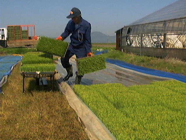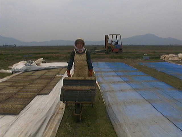 鴨親父の奥様が無農薬栽培の稲の発芽苗箱(約1000枚)を露地に並べている所です。 |
