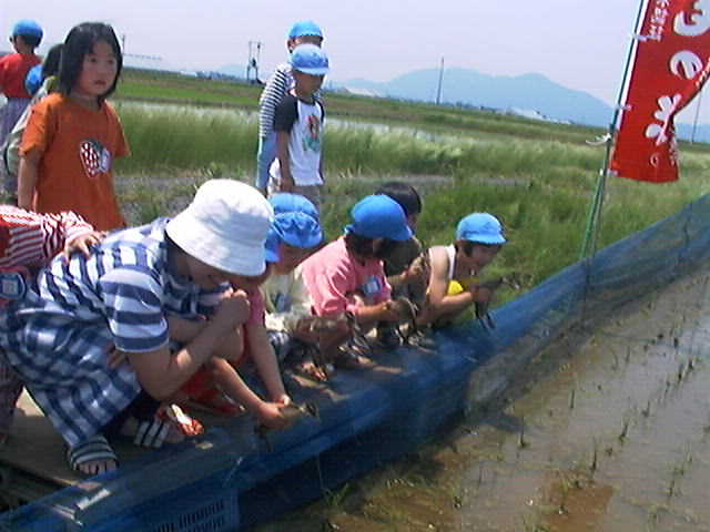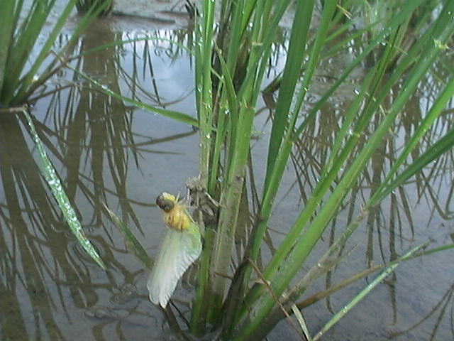 つい先日私たちのいない減農薬減化学肥料栽培(農薬散布は殺虫殺菌剤1回、除草剤2成分1回の計2回、化学肥料窒素成分で3kg以内)の田圃からトンボが大量に羽化、発生しました。周辺町村で農薬の空中撒布(ヘリコプターで)が始まろうとしています。早く山に飛んでいかないかと鴨親父も私たちも皆で気をもんでいます。 |