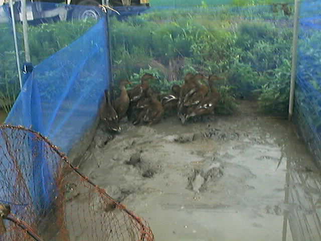 私たちは鴨親父にうまく誘導されて囲いの中に一網打尽。 飛羽が出始めてもうすぐ飛んで行けるのに残念。 これから餌をたくさん食べて冬には、脂ののった体を皆さんにごひろう致しますので楽しみにお待ち下さい。 |