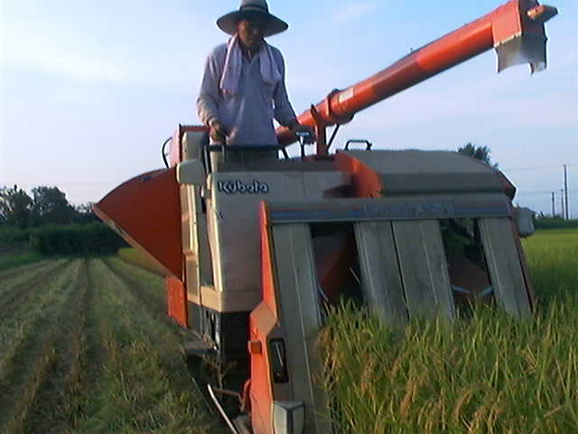 稲刈りの始まりですがまだ残暑が厳しく鴨おやじも苦しそうです。これから10月までご苦労様です。 |