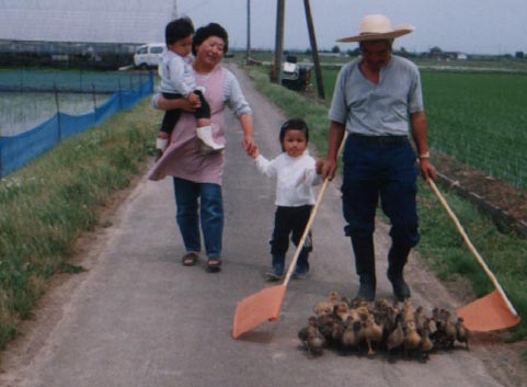 鴨親父の奥様とお孫さんと私たちの小軍団(50羽位)で田んぼまで散歩です。 |